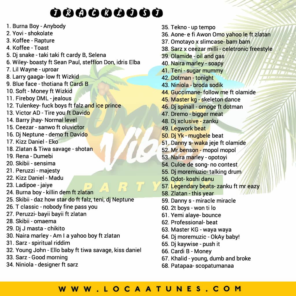 Looking at the grassroot, you know LocaaTunes is famous for presenting nothing but dope jams only, so here we are again, maintaining that good solid reputation! This mixtape is a fusion of Nigerian/Ghanian/American bangers etc., plus it’s tracklisting is phenomenal. It features appearances from Burna Boy, Dj Snake, Lil Wayne, Wizkid, Fireboy Dml, Falz, Kizz Daniel, Peruzzi, DJ Neptune, Zlatan, Naira Marley, Davido, and many more. Larry Gaga, Mr. Beat A Bang’ Bang himself is also featured on the mixtape. As you all know, at LocaaTunes, we do more and talk less.