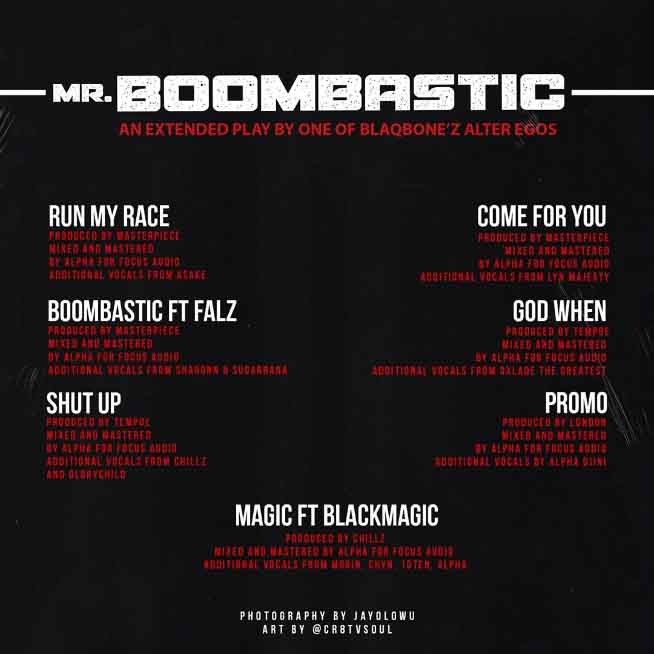 Mr. Boombastic is a seven-track project, sporting overt Reggae influence, which features a deviation from the hardcore rap style usually associated with Blaqbonez. Blaq describes Boombastic as his ‘groovy’ alter-ego, and this is emphasized over the course of the project, with Boombastic’s penchant for up-tempo dance records, as well as his use of patois and fashion sense (see EP cover).