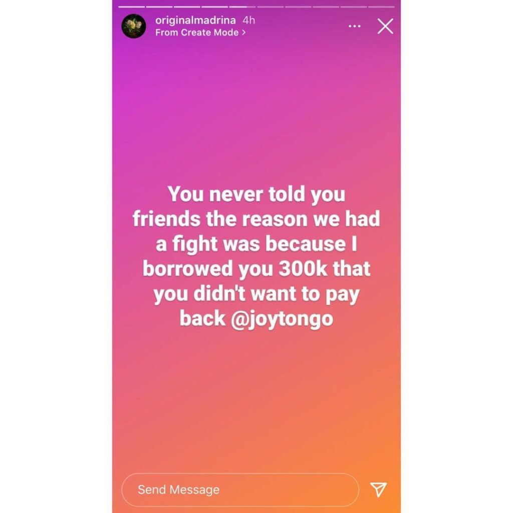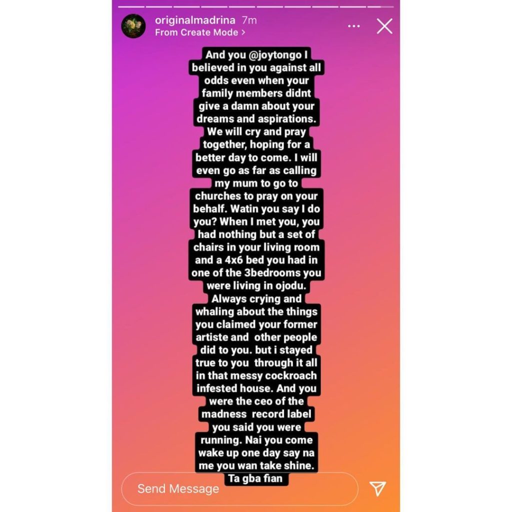 She recounted how she helped Joy Tongo after her artistes abandoned her. Cynthia Morgan also revealed what led to the end of her relationship with Joy. According to her, their relationship went sour because she asked Joy to pay back the #300,000 she lent her.