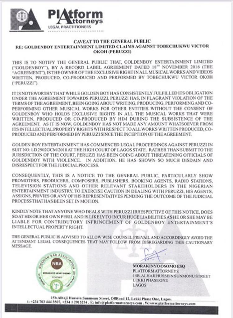 The statement in part reads; “Golden Boy Entertainment has commenced legal proceedings against Peruzzi in suit no: LD 2902GCM/2018 at the high court of Lagos state.